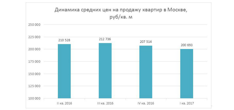 В I квартале 2017 года по сравнению с прошлым периодом стоимость квадратного метра вторичной недвижимости в среднем по Москве стала ниже на 3,3%. Если ранее средняя цена за квадратный метр в городе составляла 207,5 тыс. руб., то в I квартале 2017 года – 200,7 тыс. руб. Квартиры в Москве по-прежнему значительно дороже, чем в среднем по России: цена кв. м московского жилья в 3,4 раза выше, чем средний показатель по стране.