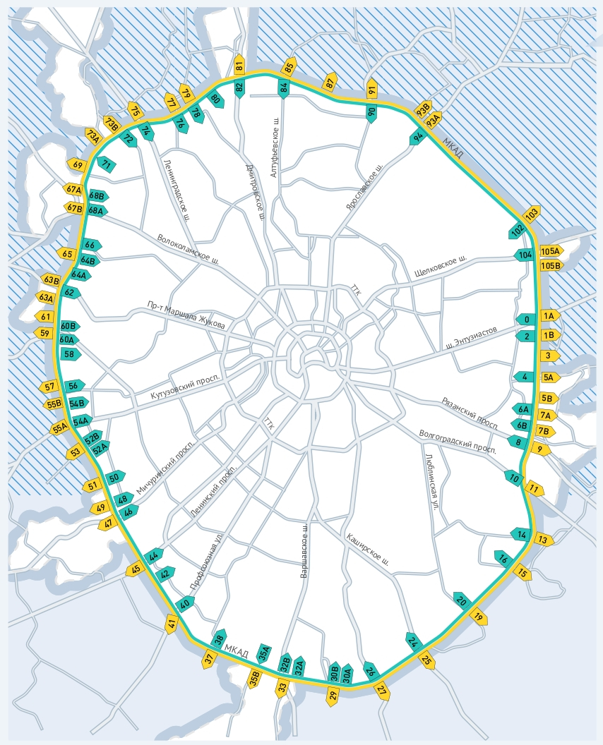Съезды с МКАД теперь пронумерованы по километражу. Для нумерации использованы числа от одного (съезд на Шоссе Энтузиастов в центр) до 105 (съезд на Щелковское шоссе в область).